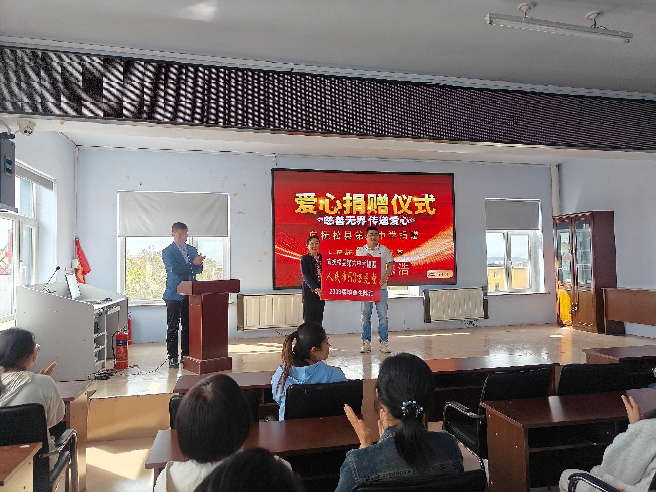 黉门旧育凌云木,今报新枝万叶青。9月17日,抚松县第六中学举行了捐赠助学仪式,2009届毕业生陈浩先生向母校捐赠50万元资金助力学校教育事业发展。