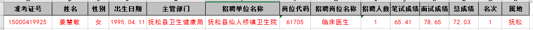 附:2020年抚松县事业单位公开招聘工作人员公告(1号)(卫生岗位)1个拟进入体检考察环节人员成绩。