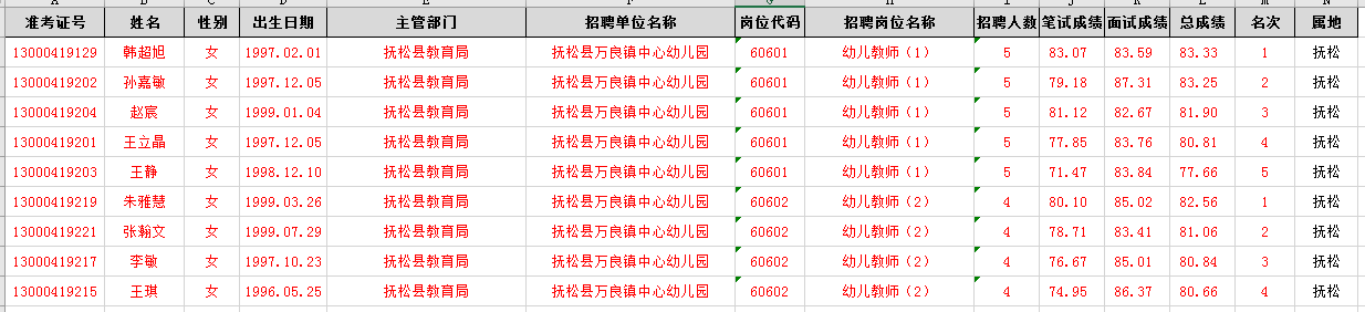 附:2020年抚松县事业单位专项招聘工作人员公告(1号)(教师岗位)9个拟进入体检考察环节人员成绩。