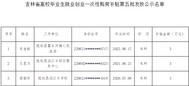 根据省委、省政府《关于促进高校毕业生就业创业若干措施》(吉发(2024)7号)及《吉林省高校毕业生就业补贴实施细则(暂行)》等6项实施细则的文件精神,现将吉林省高校毕业生就业创业一次性购房补贴发放人员名单公示如下: