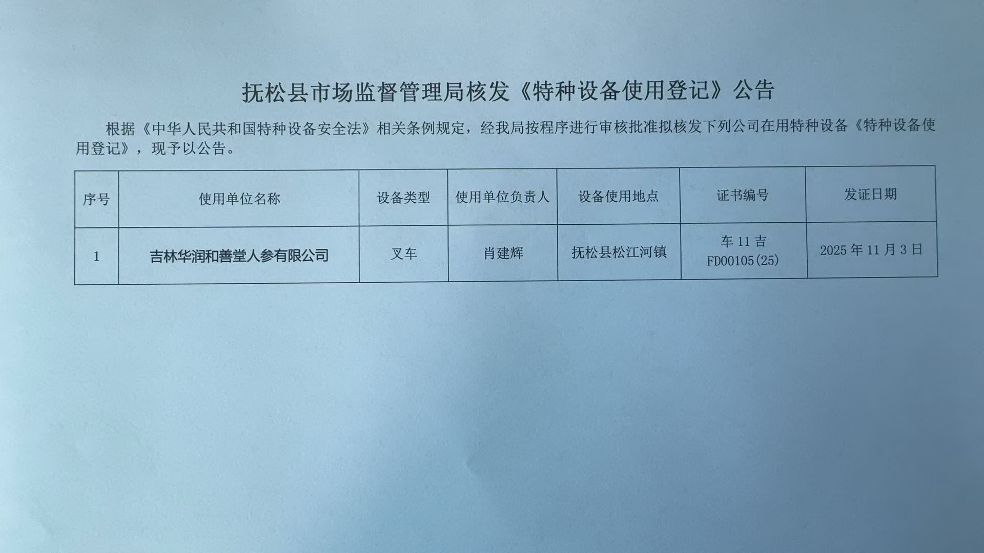 抚松县市场监督管理局核发 《特种设备使用登记》公告