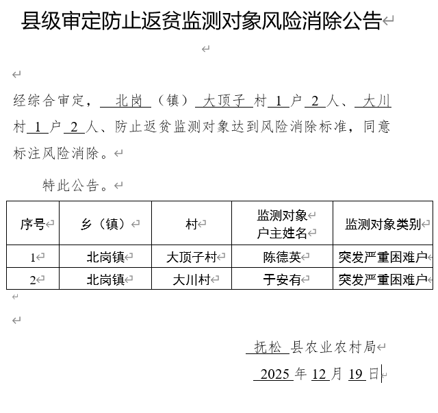 县级审定防止返贫监测对象风险消除公告