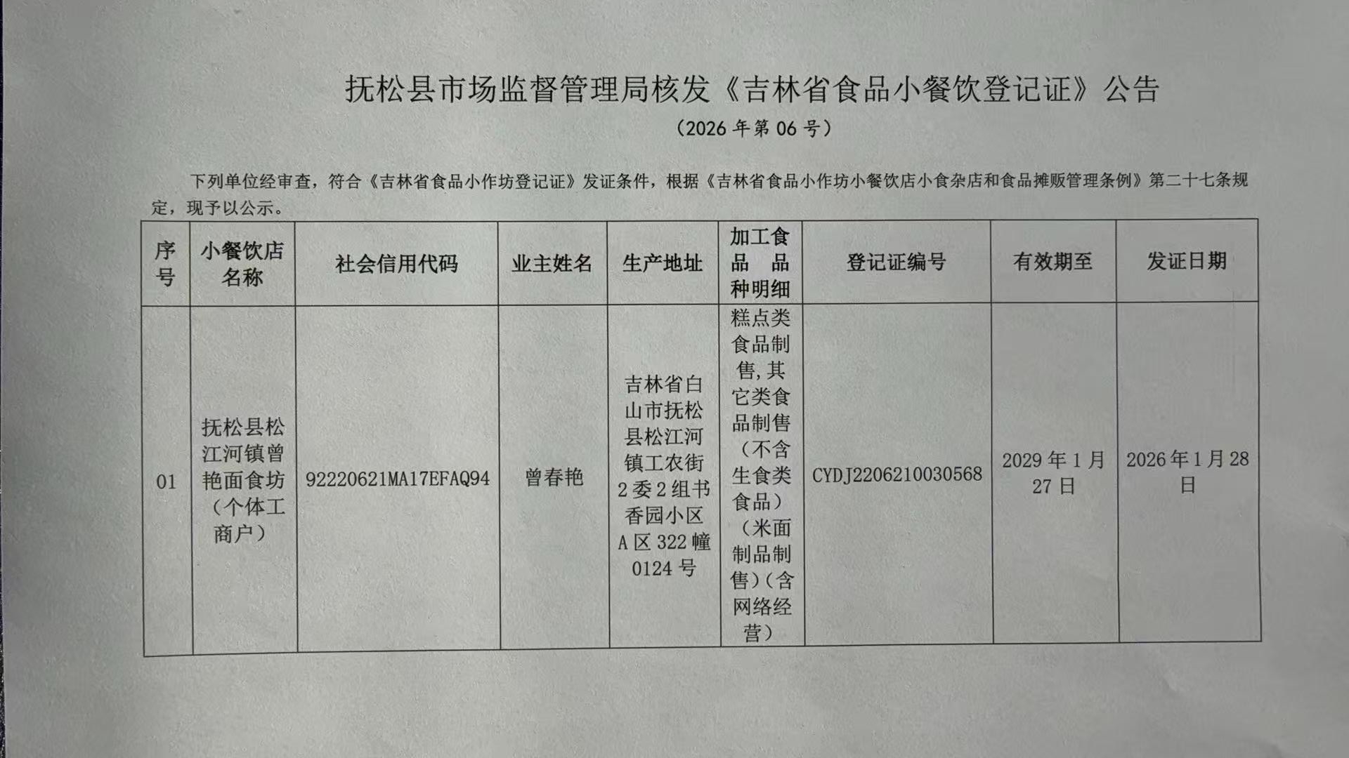 抚松县市场监督管理局核发《吉林省食品小餐饮登记证》公告(2026年第06号)