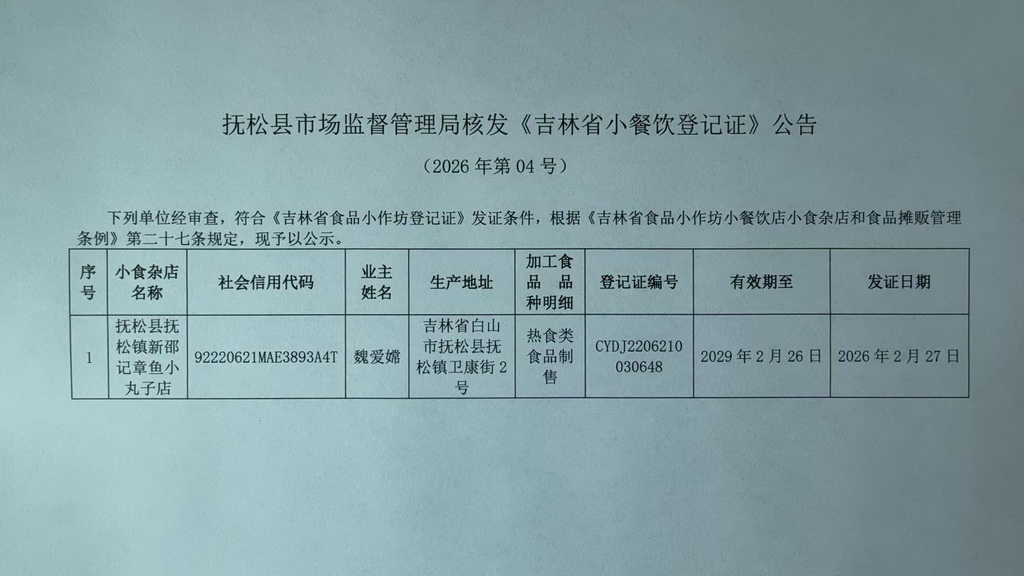 抚松县市场监督管理局核发《吉林省小餐饮登记证》公告