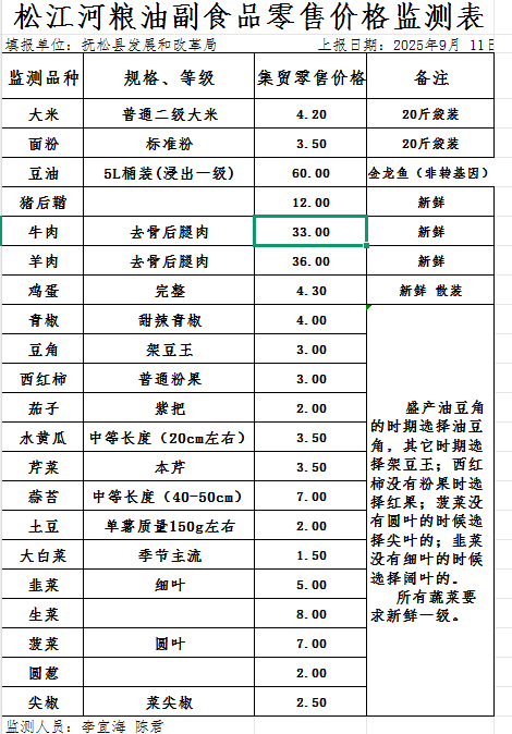 松江河粮油副食品零售价格监测表