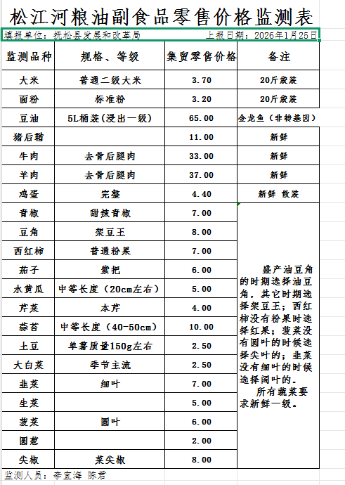 松江河粮油副食品零售价格监测表