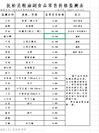 抚松县粮油副食品零售价格监测表