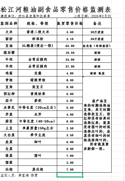 松江河粮油副食品零售价格监测表