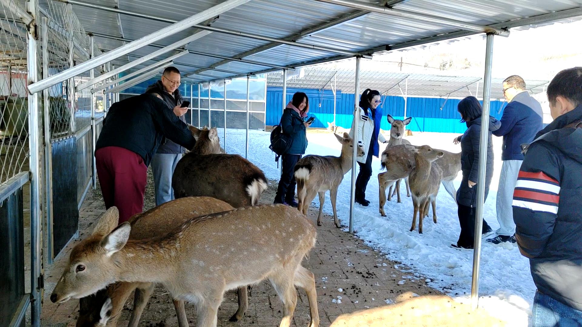随着镜头,记者看到一批南方游客旅游团造访农场,看到人群,农场里的梅花鹿显得更加活泼,有的游客购买鹿食进行投喂,有的低头抚摸小鹿、有的和小鹿一起合影留念,大家欢乐的笑声将冬日里的寒冷一扫而光。农场老板王艳国说:“这已经是本月到访的第四批客人啦!有旅游团、研学团队、直播带货团队,最近这几个月有好多客人都是听之前来过的客人介绍而来的,说咱们这鹿性格又温顺,又可爱!”