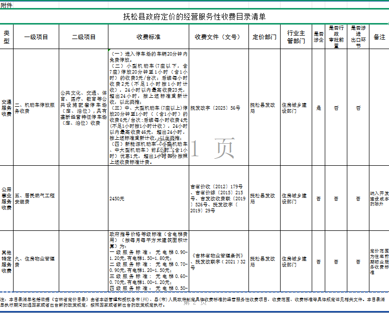 附件:抚松县政府定价的经营服务性收费目录清单